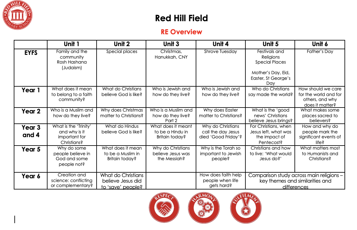 At Red Hill Field we are knowledgeable about world religions and respectful of those of all faiths and those of none. We promote tolerance and harmony.
